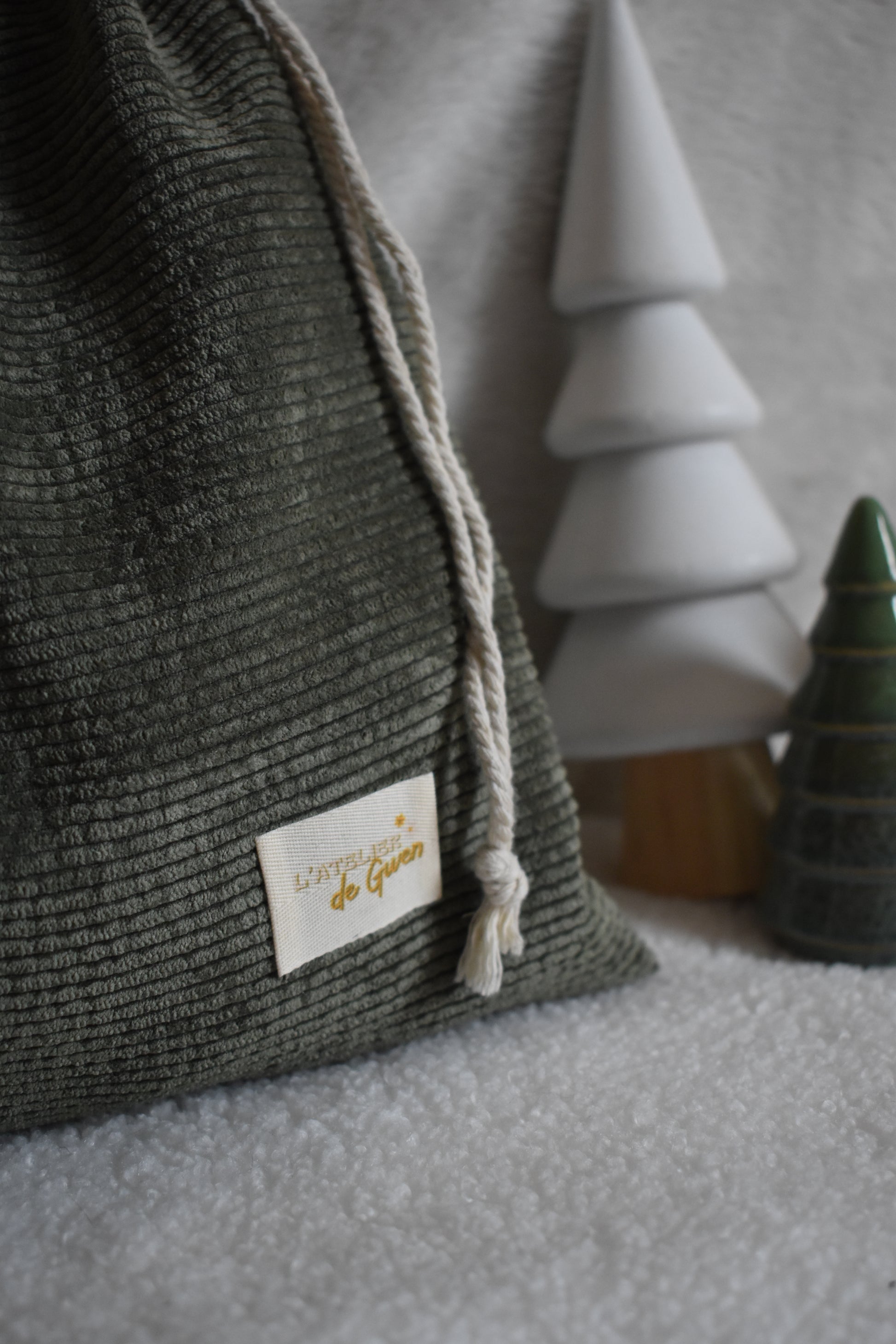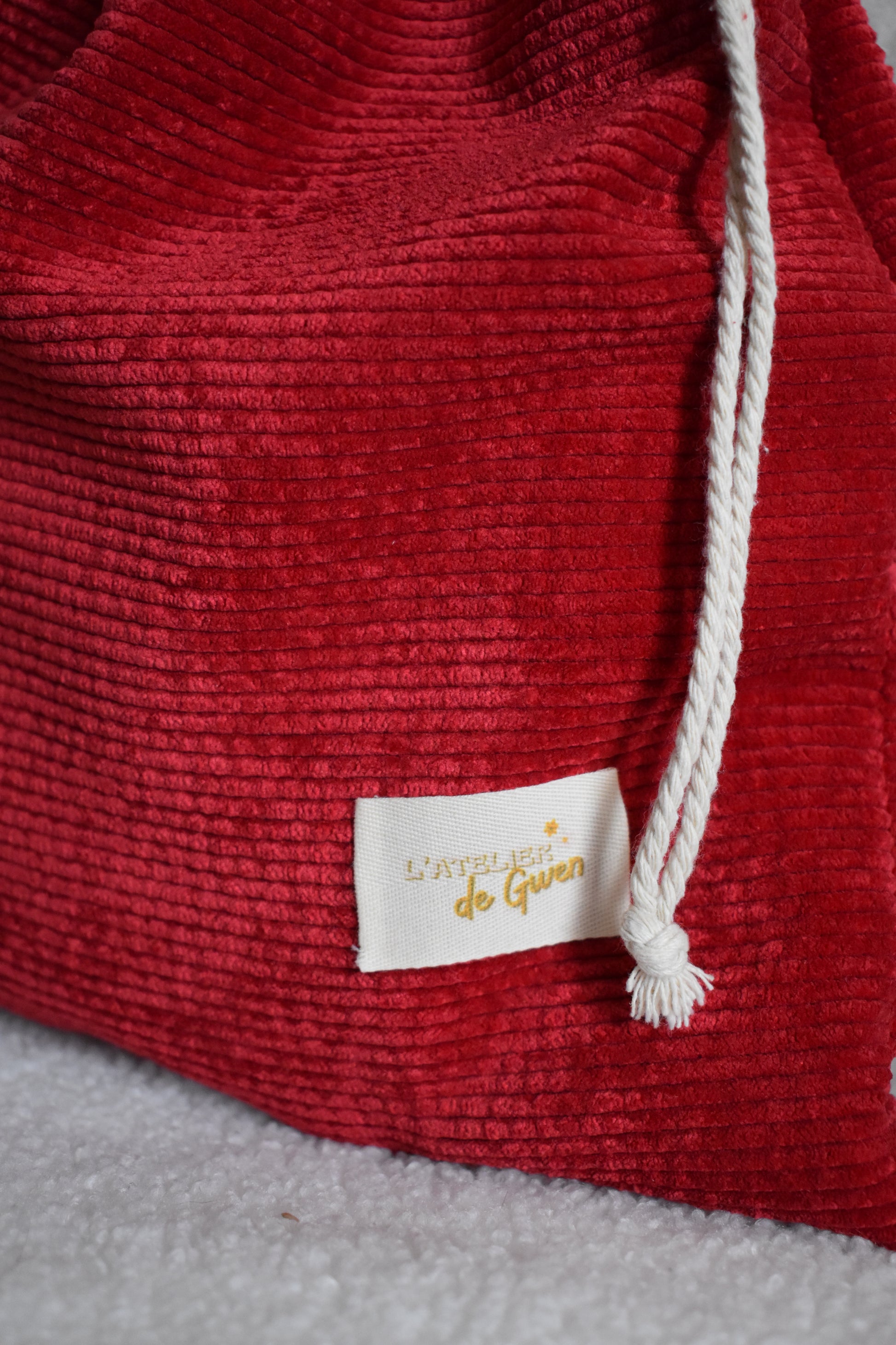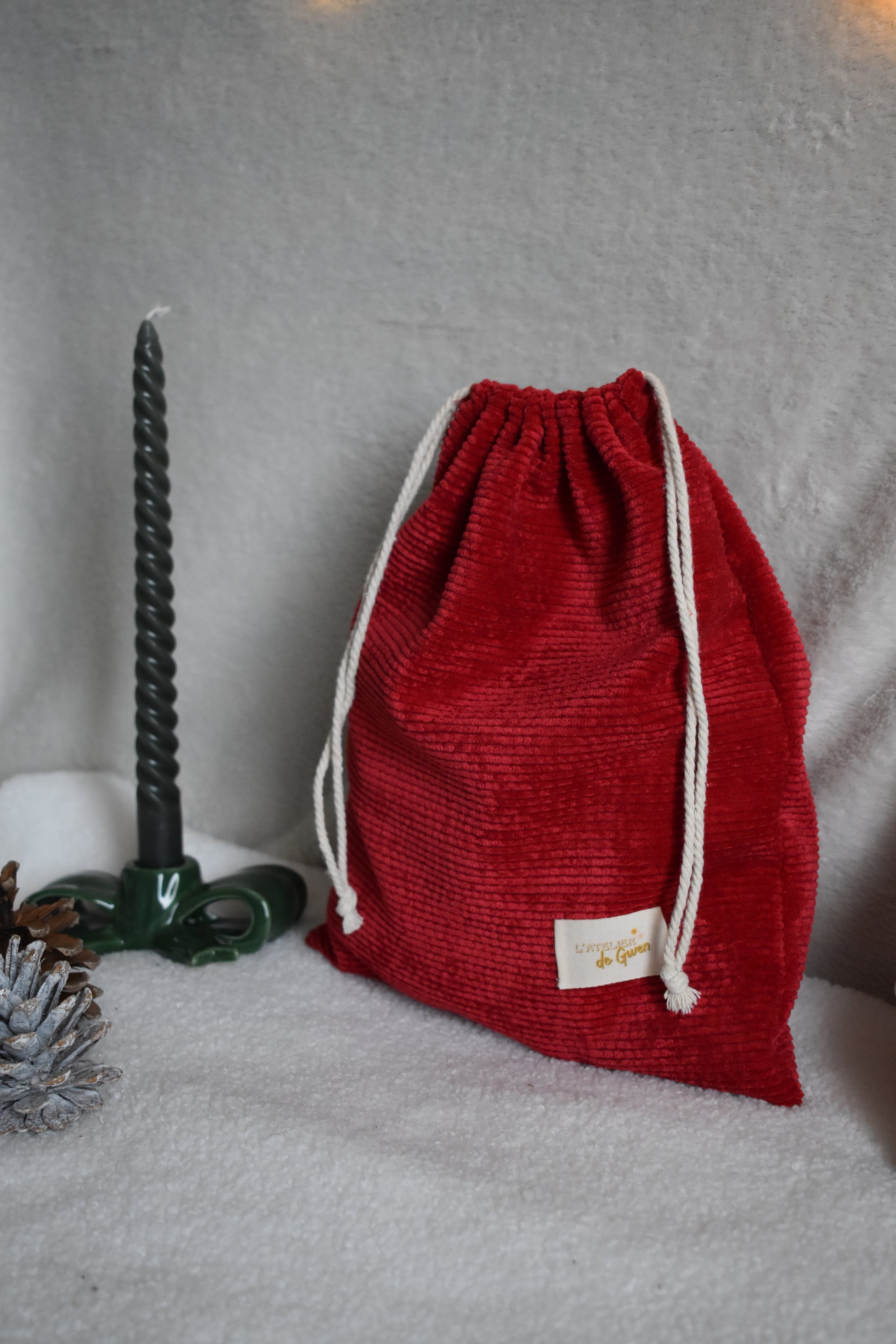 Cette année, nous avons décidé de mettre encore plus en avant le fait-main avec la création du contenant de notre calendrier ! Un grand pochon en velours côtelé en collaboration avec l'Atelier de Gwen 🌻