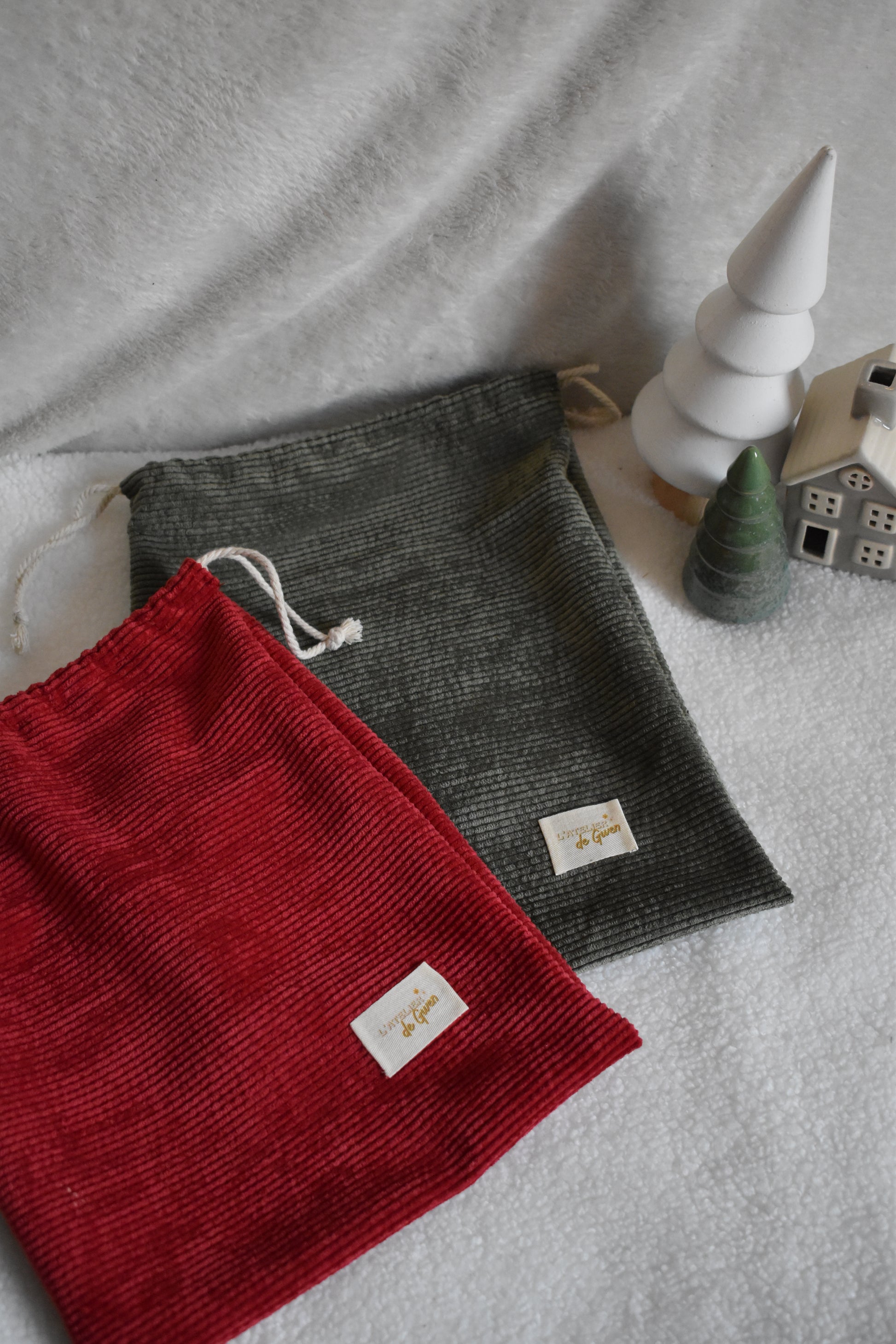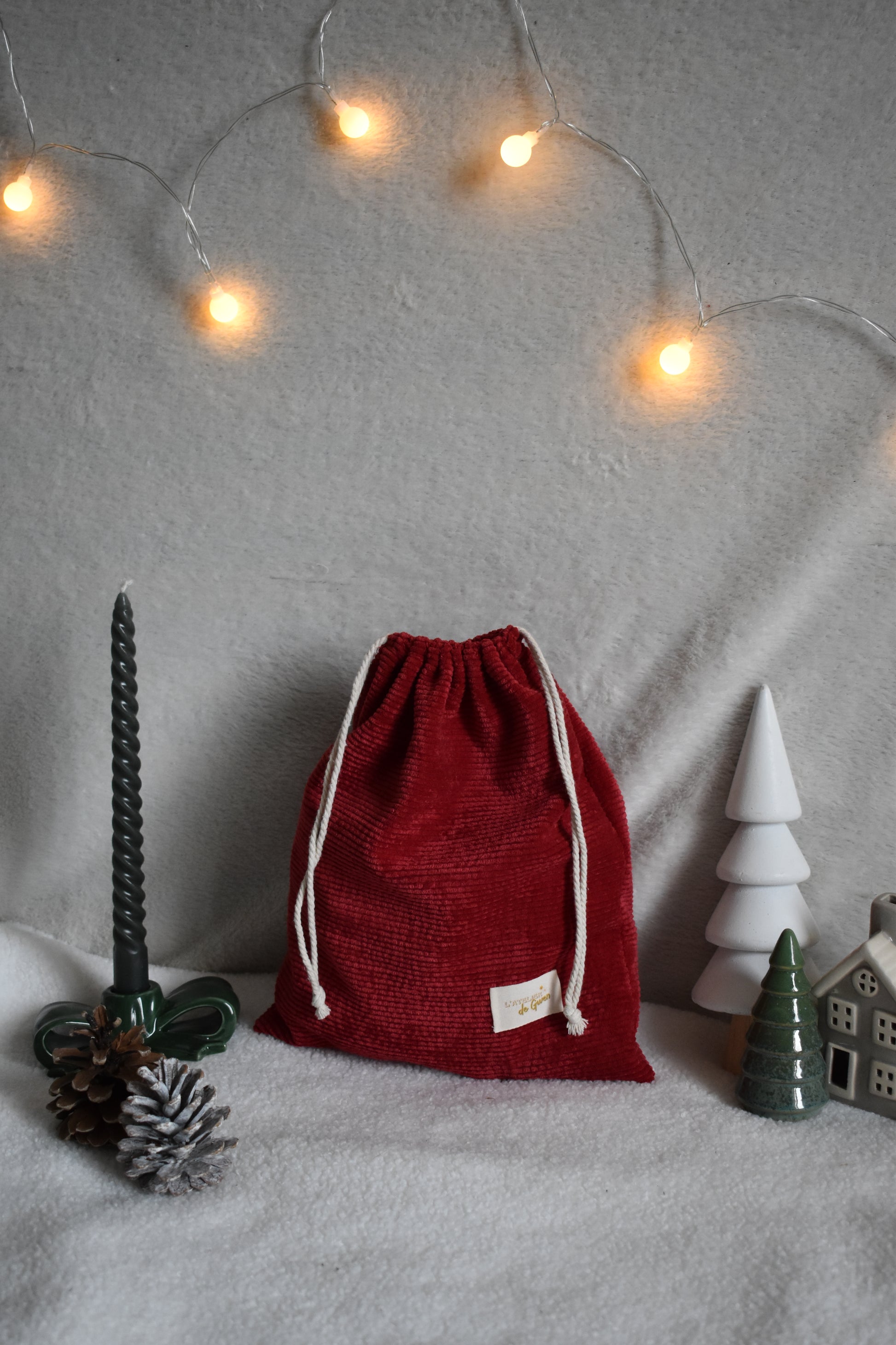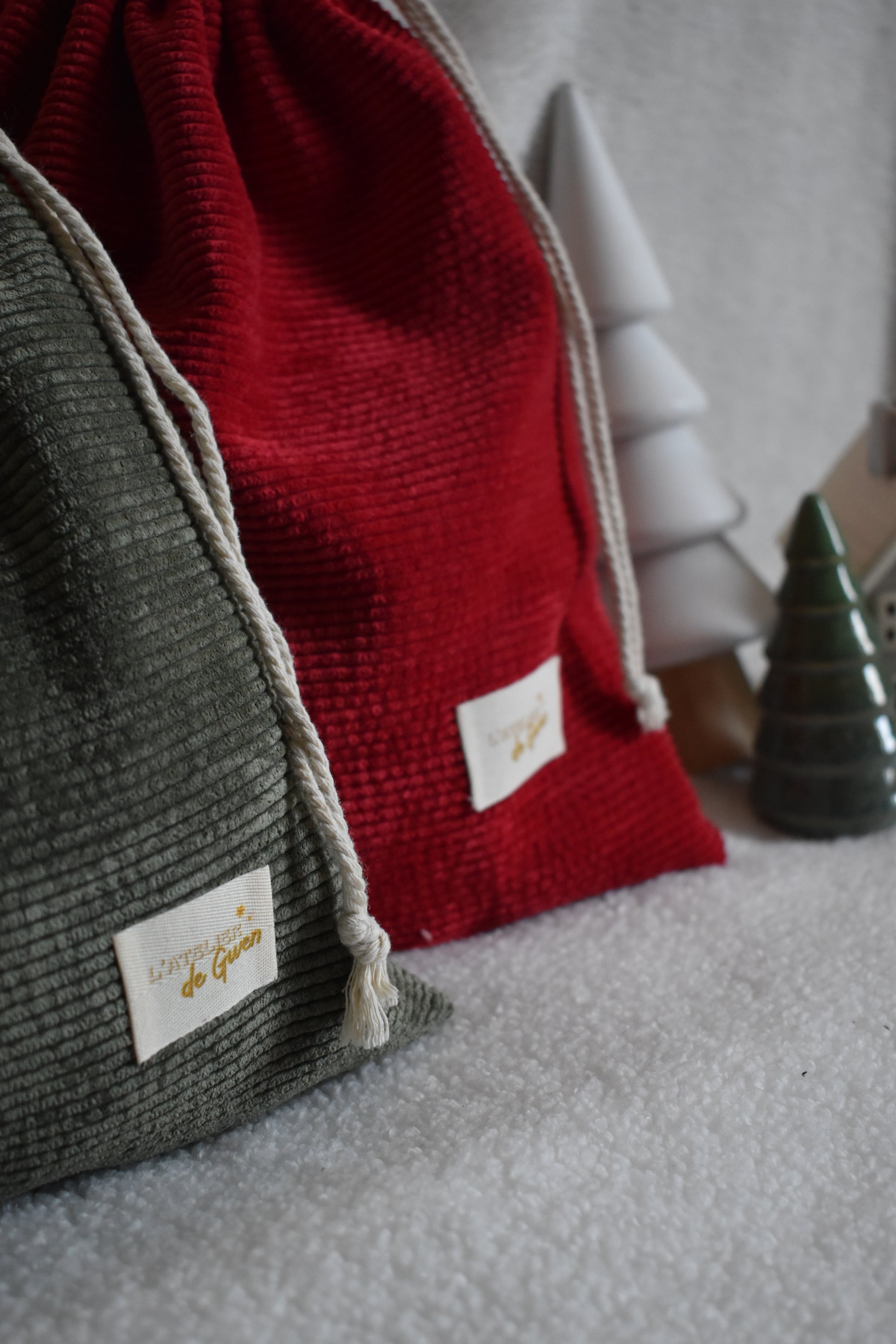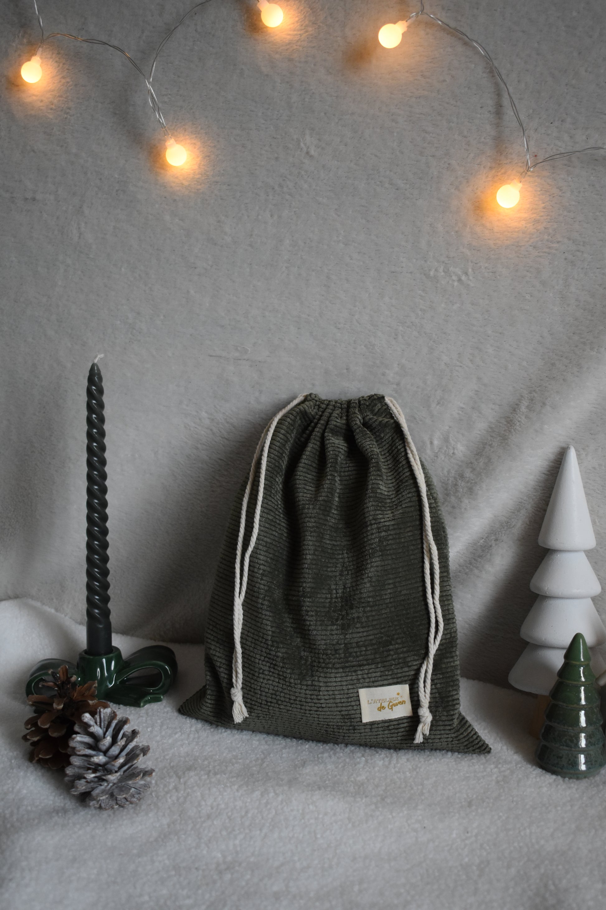 Cette année, nous avons décidé de mettre encore plus en avant le fait-main avec la création du contenant de notre calendrier ! Un grand pochon en velours côtelé en collaboration avec l'Atelier de Gwen 🌻